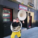 No pudimos abrir pero ya La Discotaberna olia a música. El abuelo con su tuba haciendo de modelo